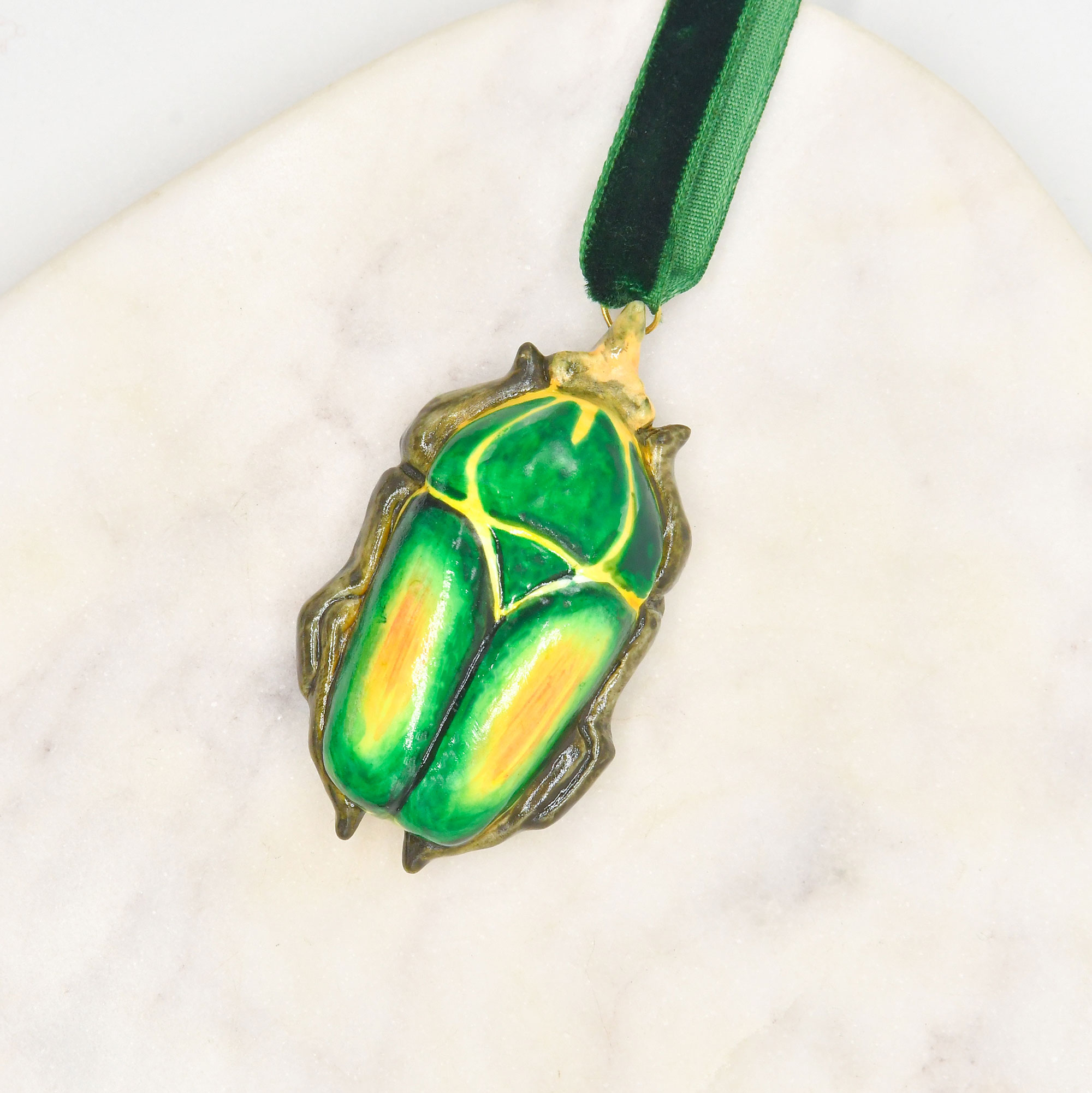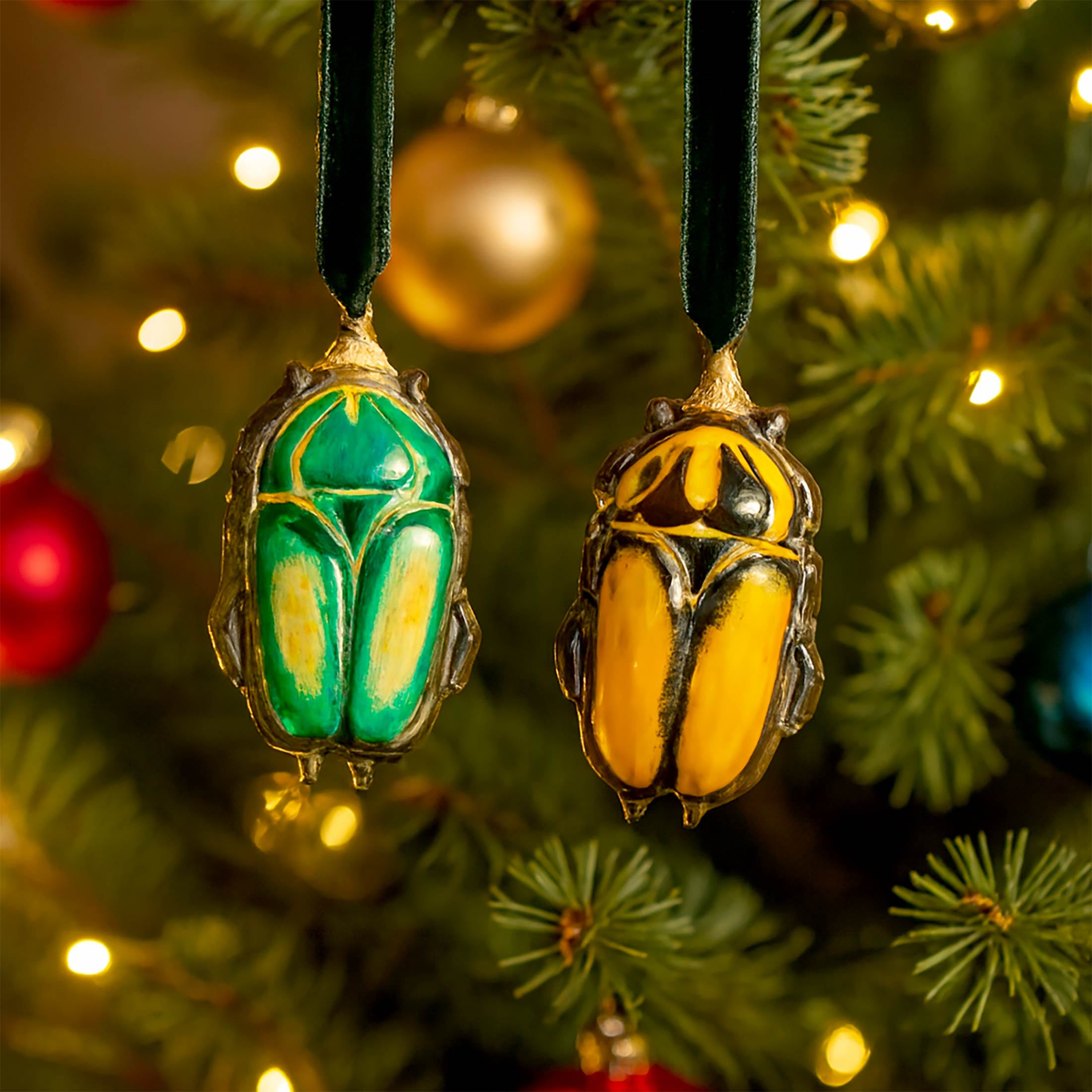 Delight in your very own cabinet of curiosities this festive season inspired by the natural world. These exquisite porcelain beetle ornaments celebrate the intricate colours and ancient symbolism of this fascinating creature, brought to life through hand-painted green and orange-yellow accents with delicate gilded touches.