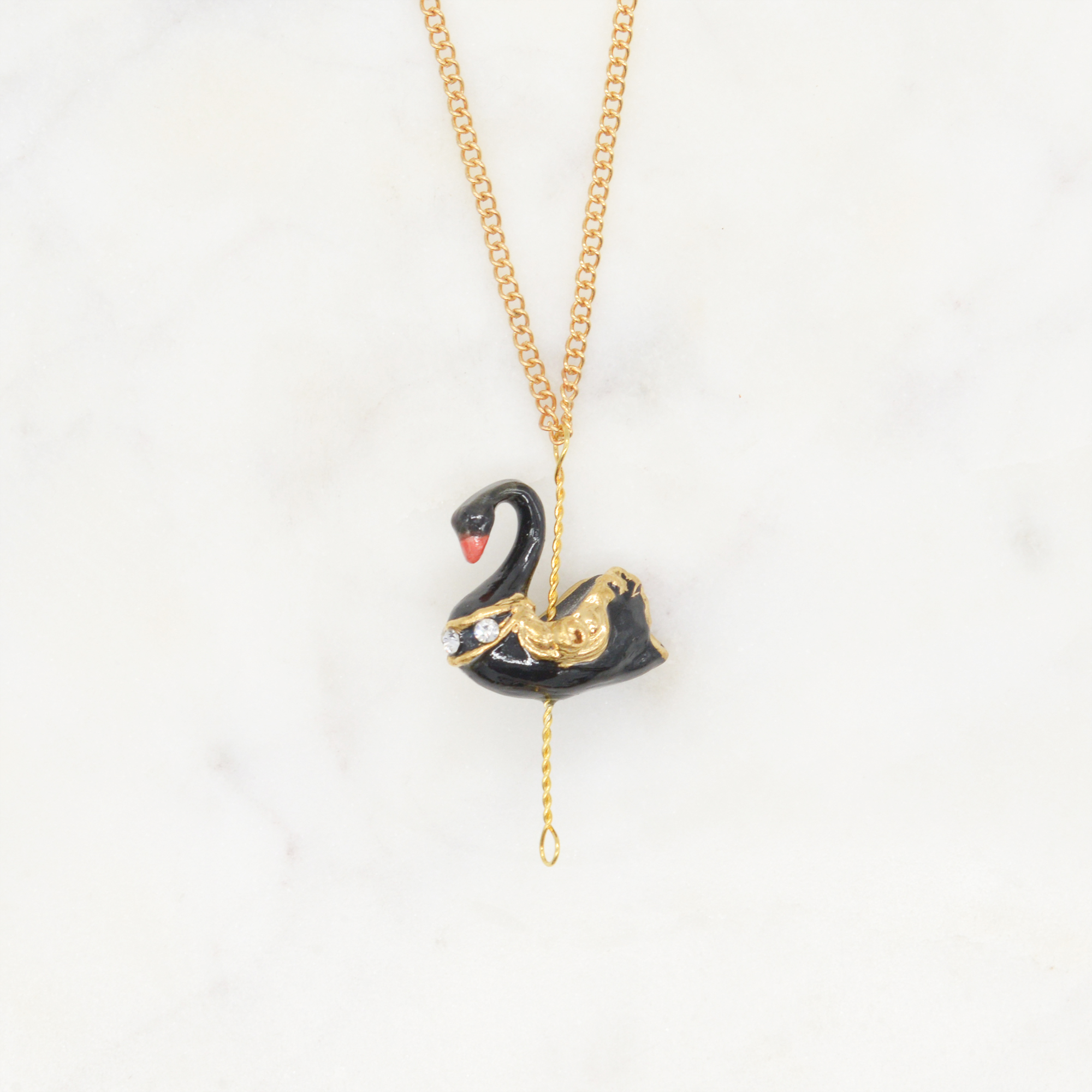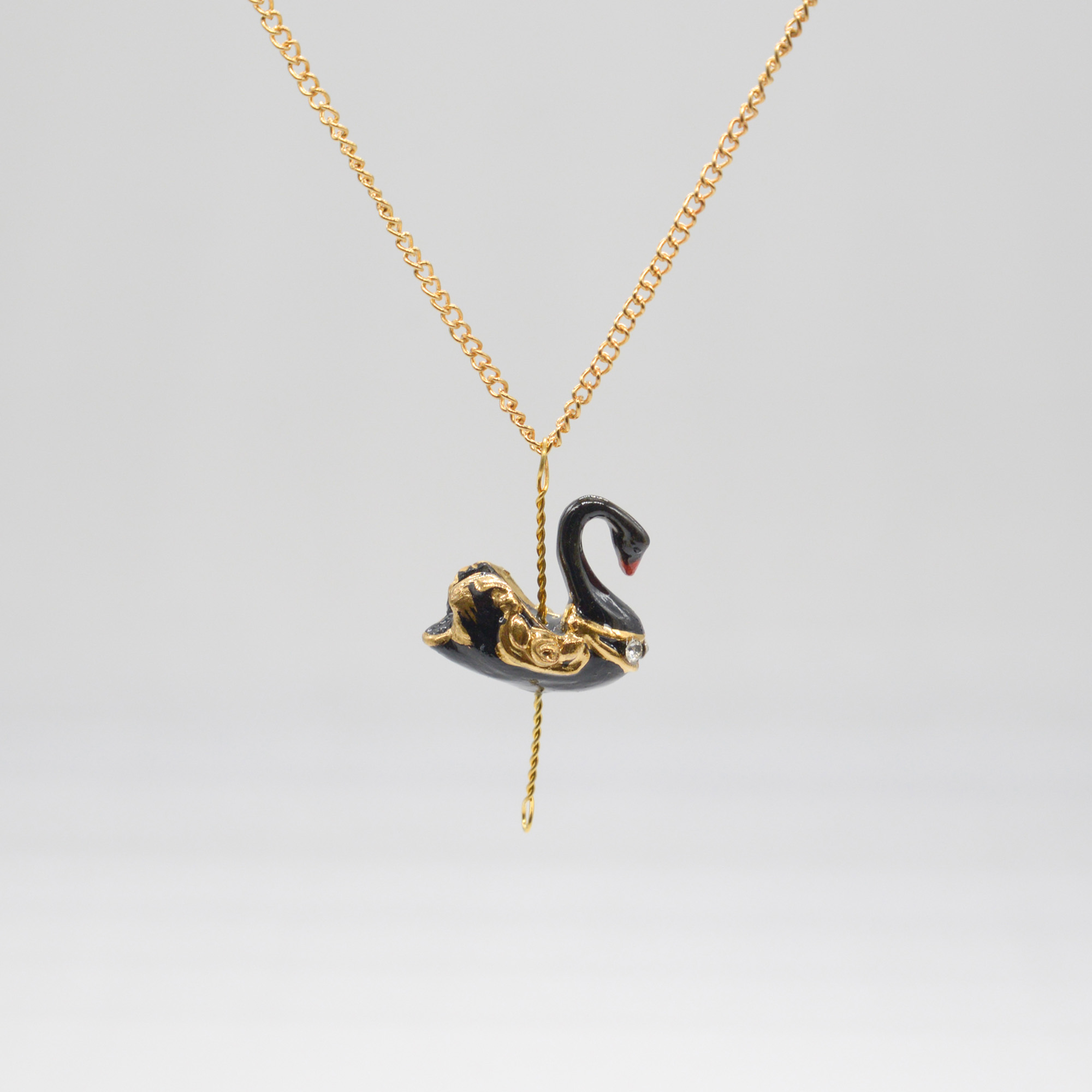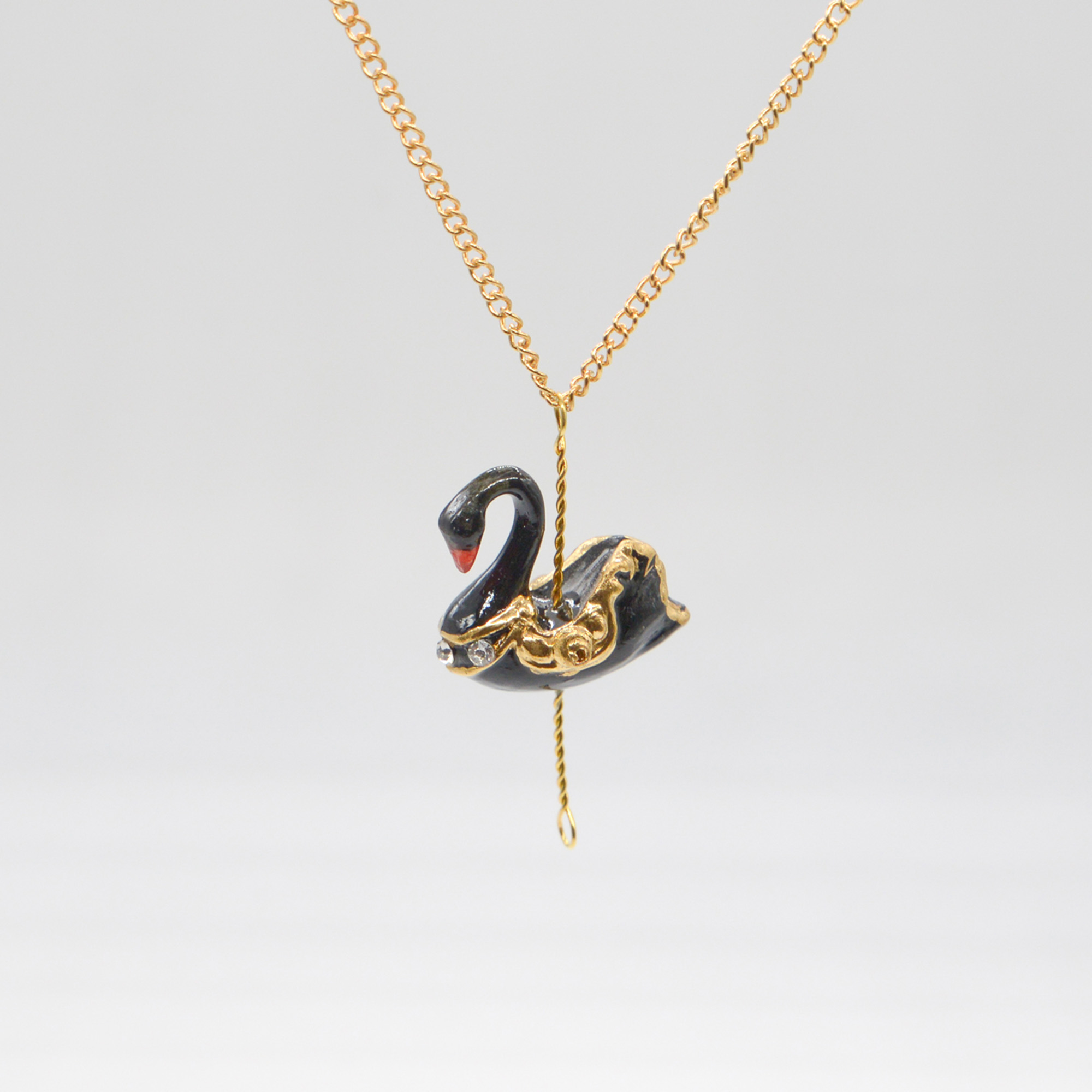 The magical porcelain pendant in a small black swan design with 18″ gold plated chain.