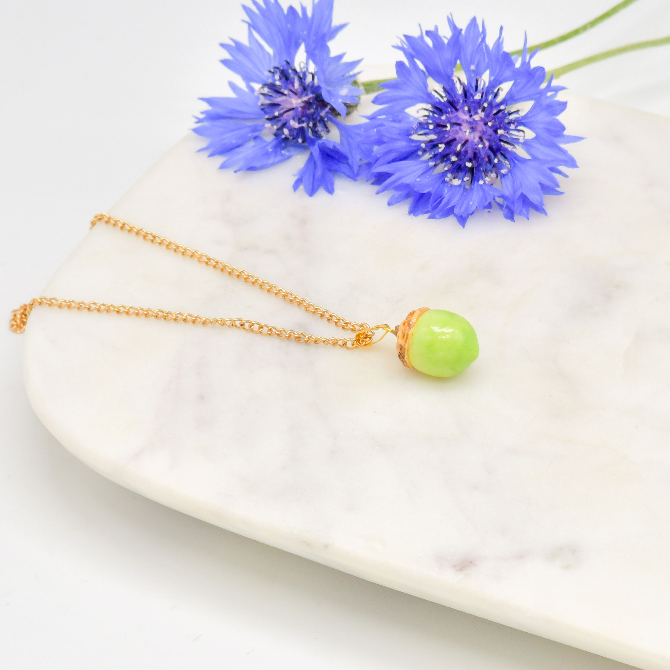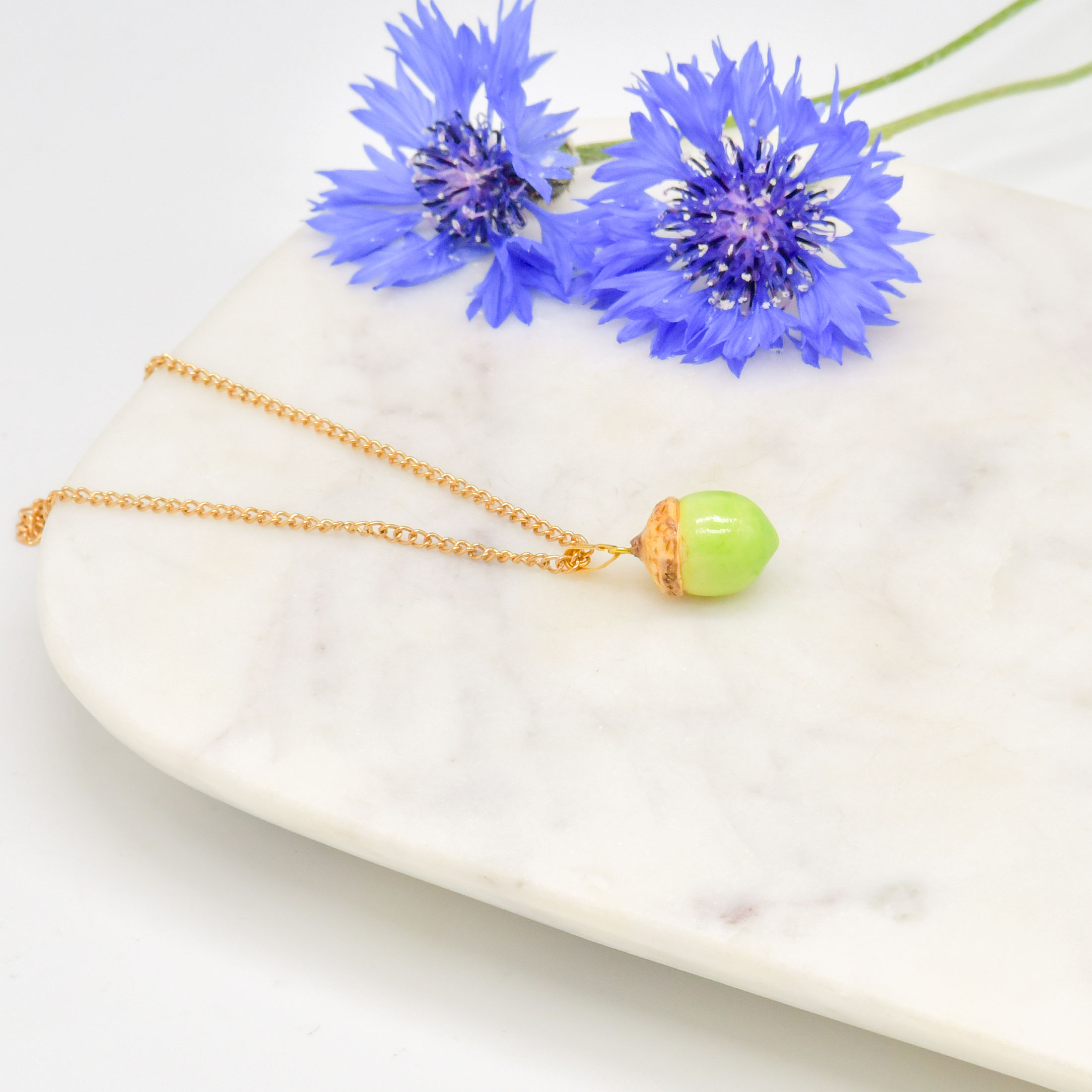 Each piece is unique and hand finished. Acorn pendant size: L1.1xW1.1 xH1.5 cm.
