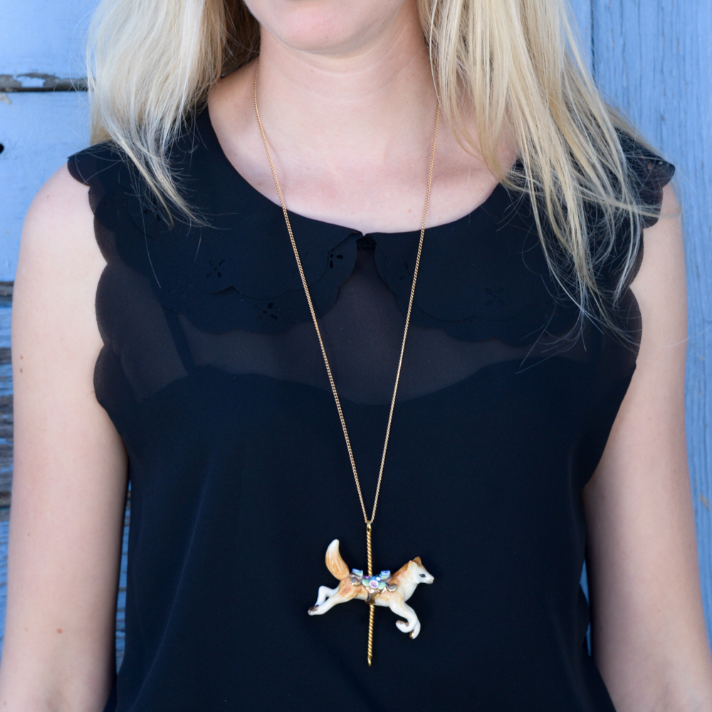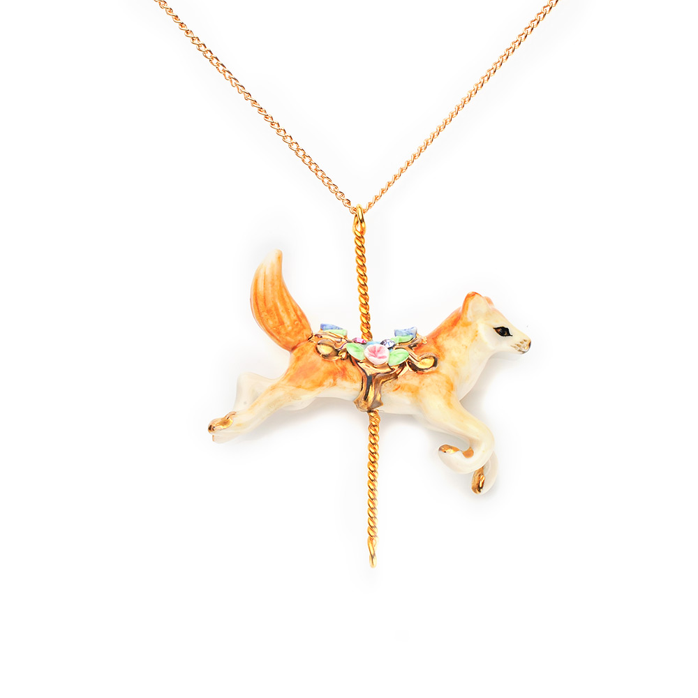 Porcelain fox pendant with 24″ gold plated chain.