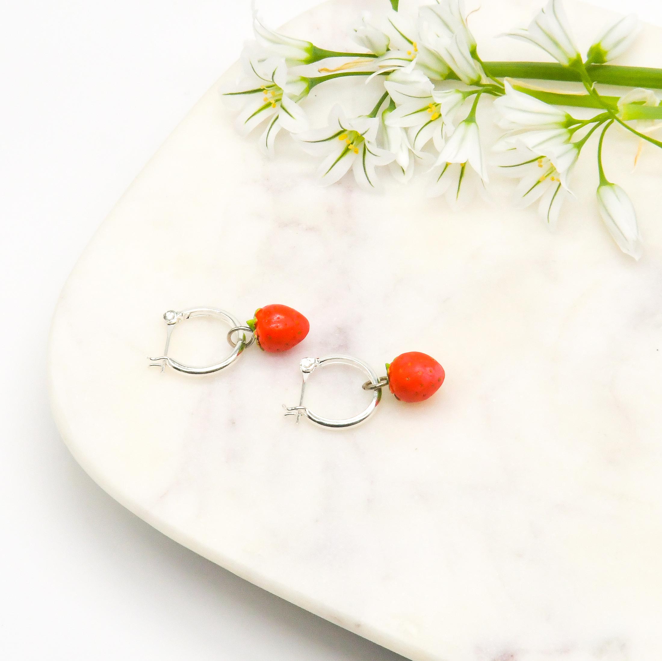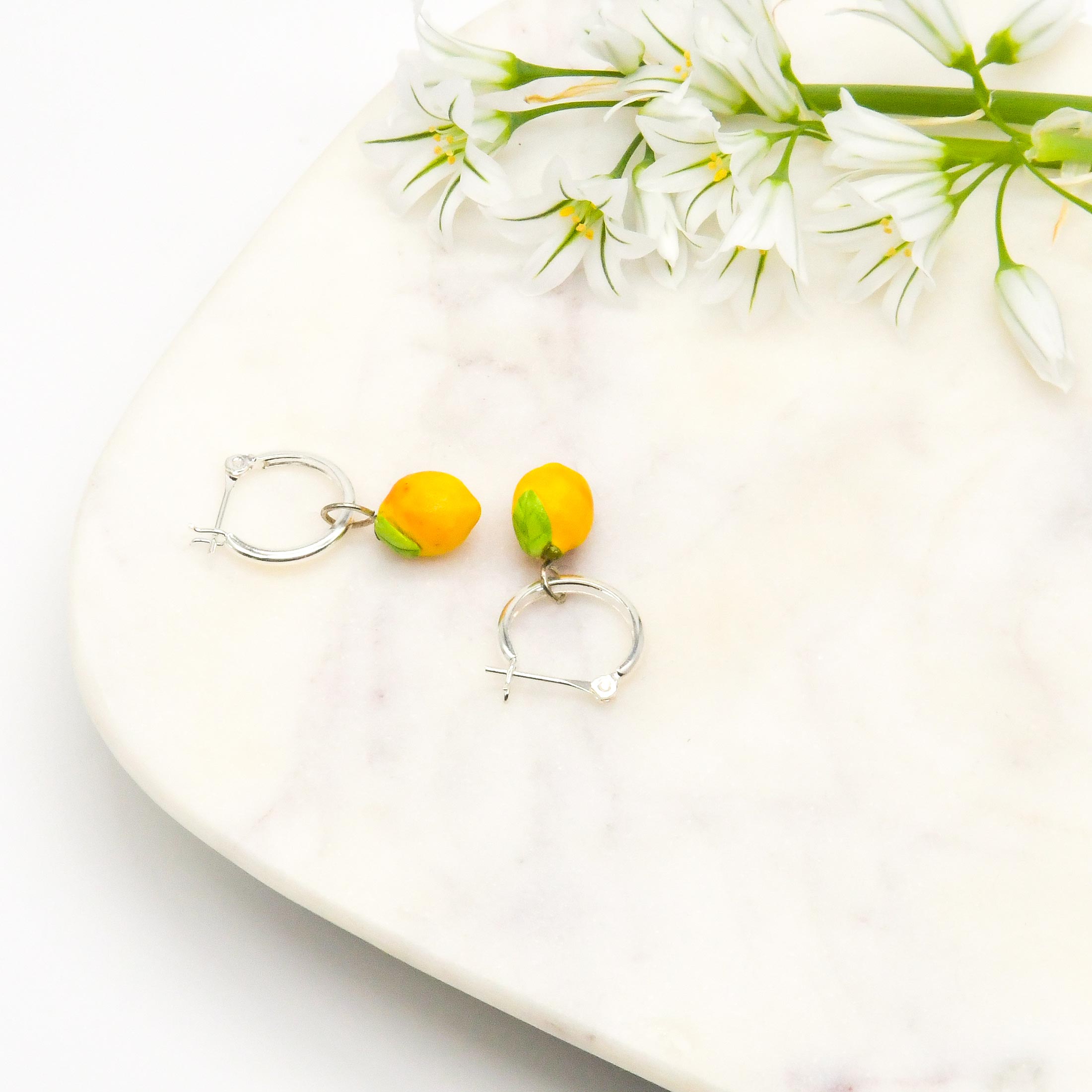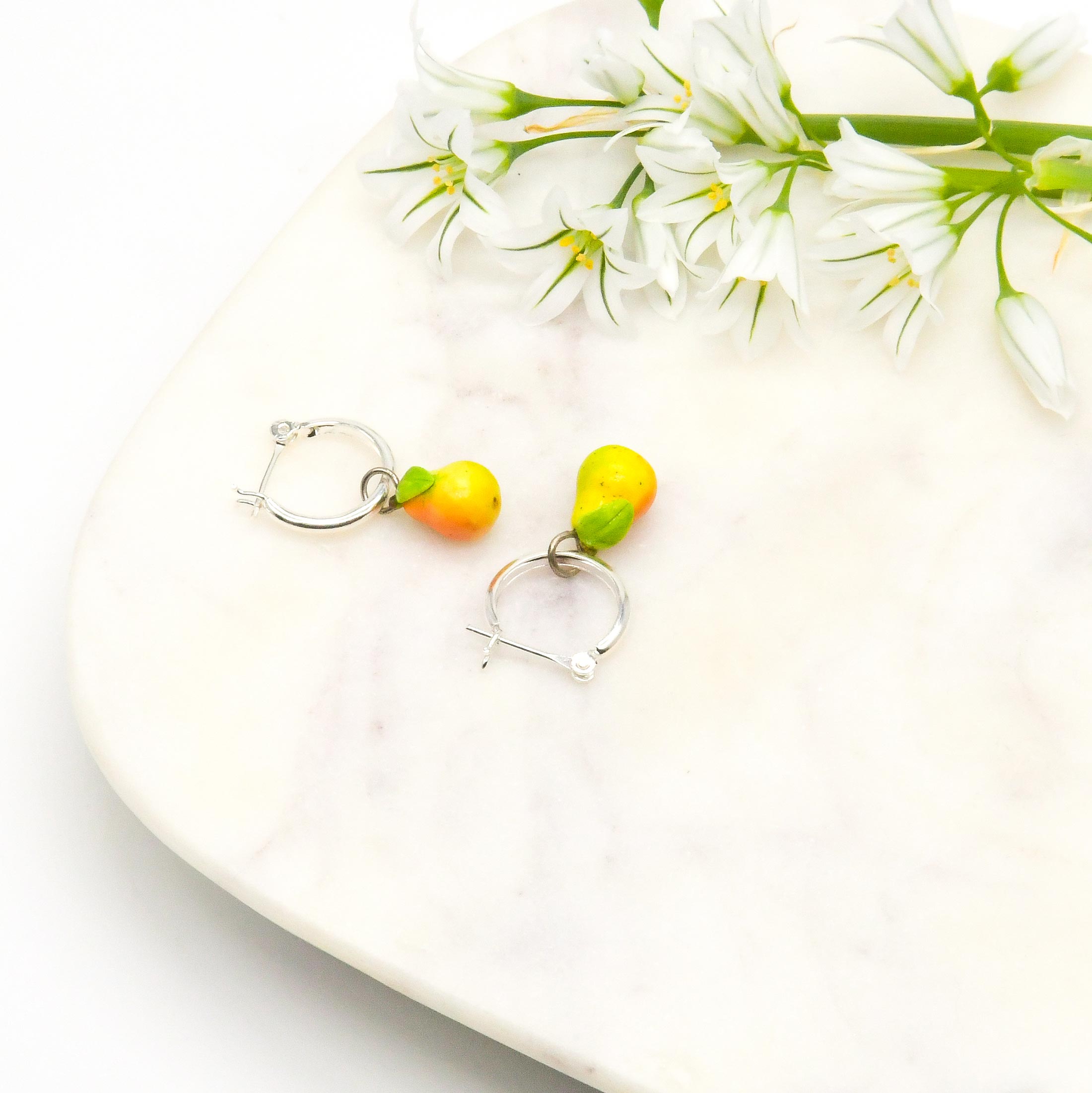 Porcelain fruit sterling silver hoop earrings comes into 5 different types of fruit; Lemon, Strawberry, Pear, Orange and Apple.