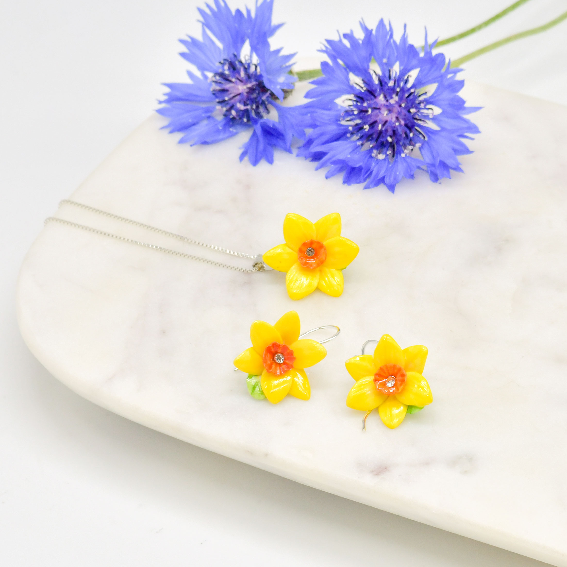 Porcelain yellow daffodil pendant comes with 18″sterling silver necklace chain.
