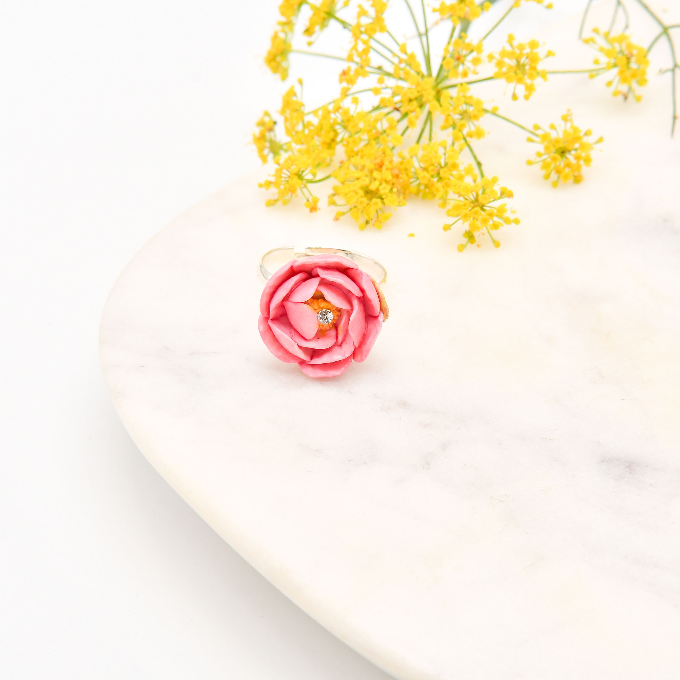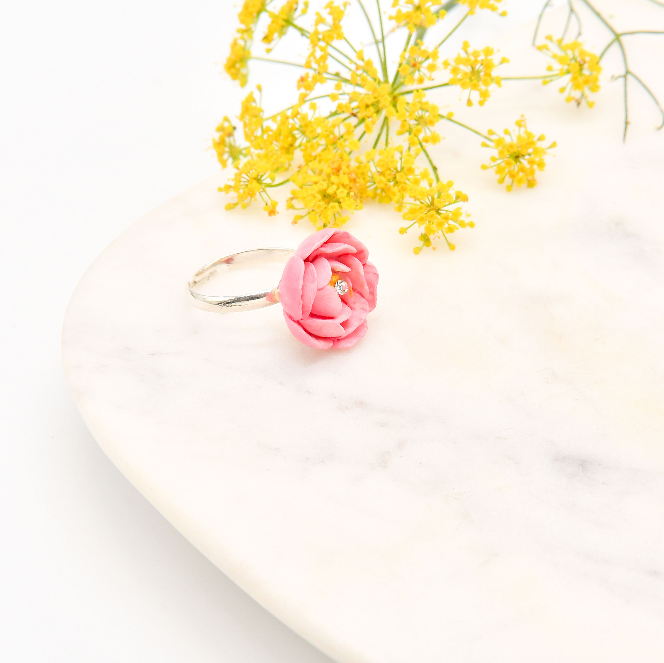 Beautiful porcelain peony ring is hand painted and embellished with Swarovski crystal detail.