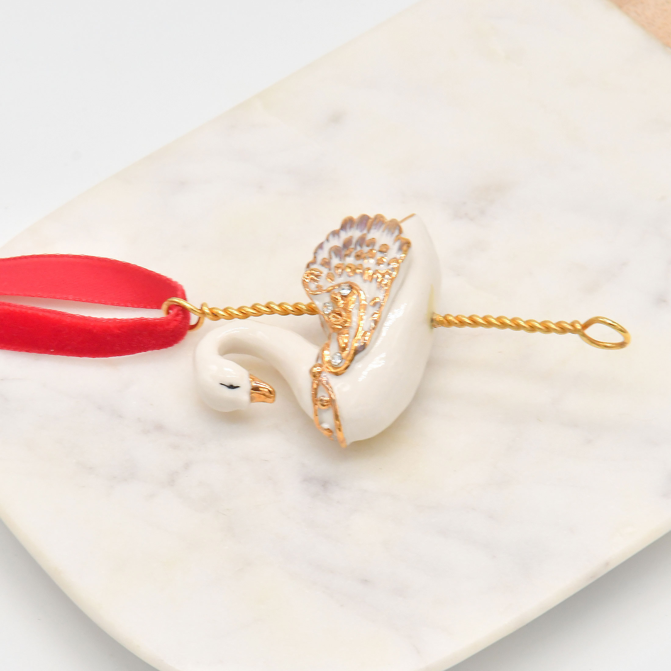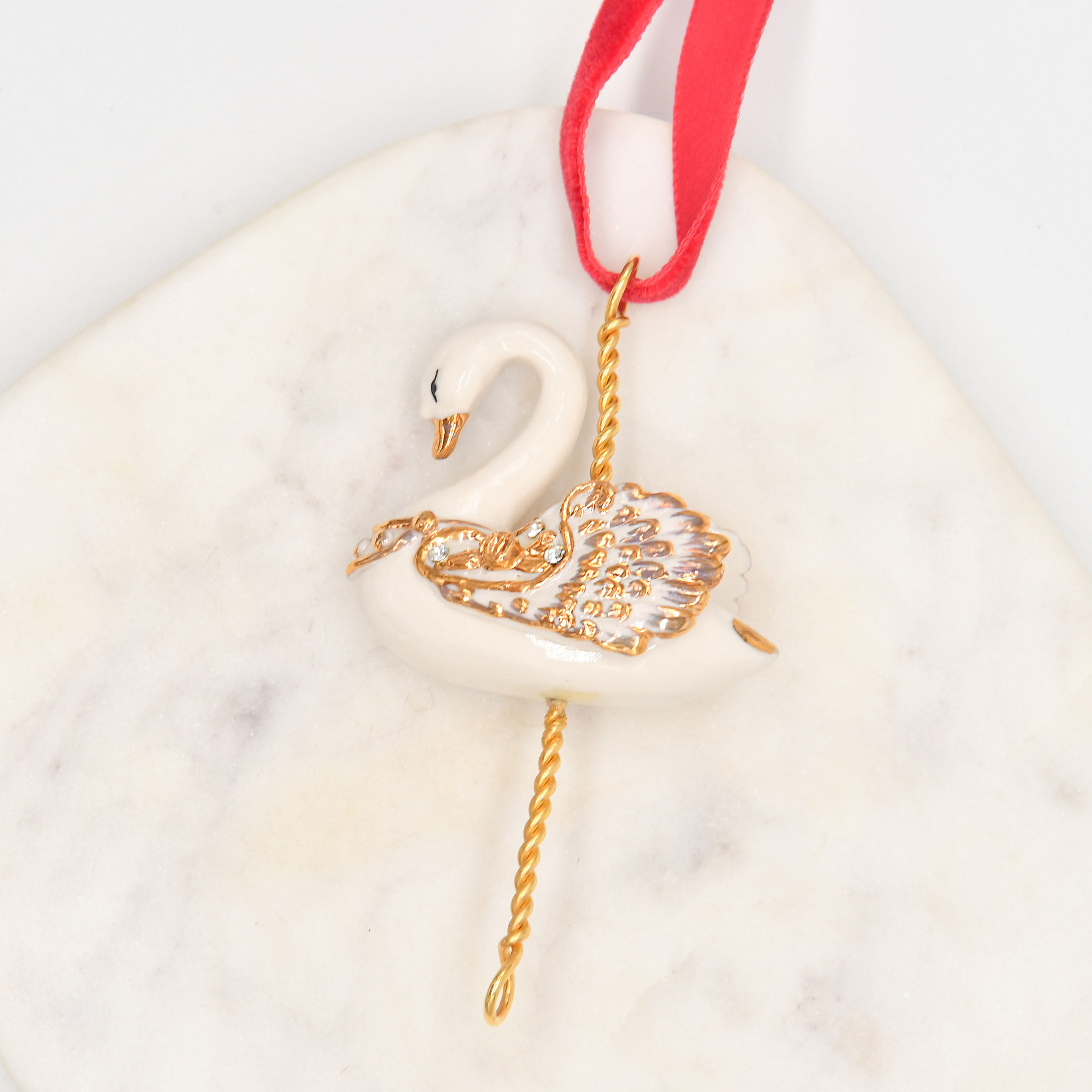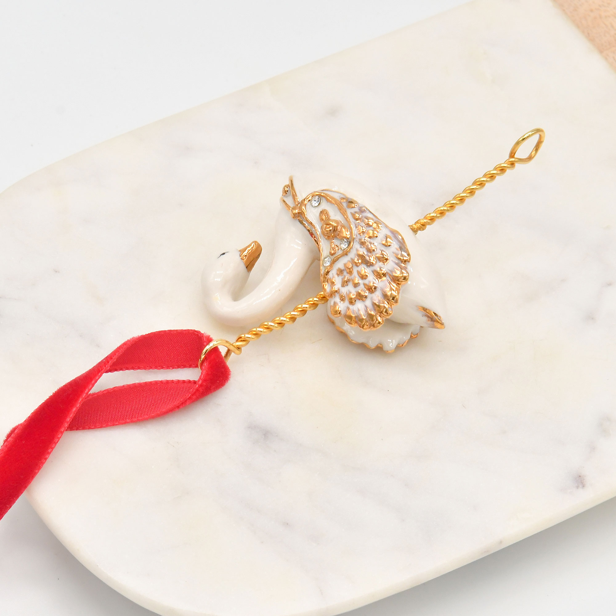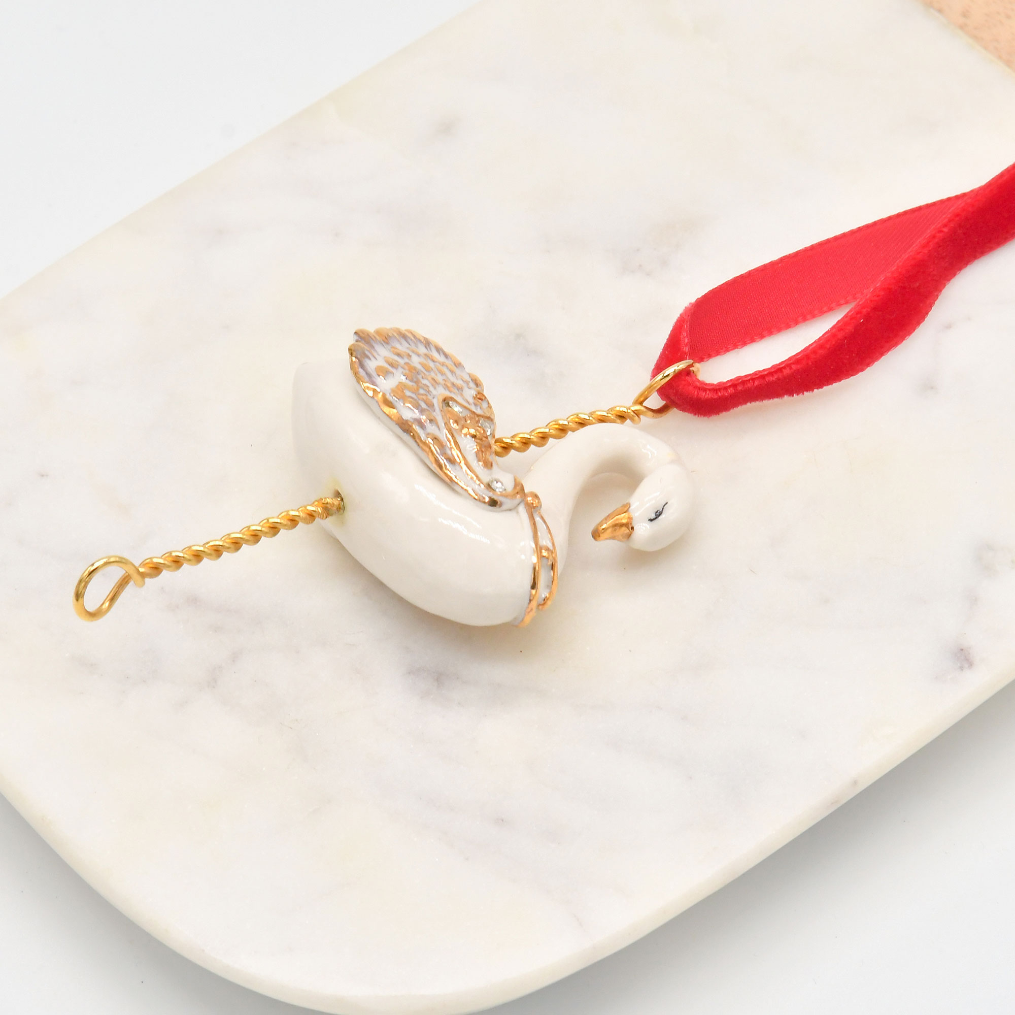 Our White Swan Christmas Tree Decoration is a luxury Christmas ornament designed to bring grace, elegance, and sophistication to your holiday decor. Handcrafted from porcelain, this stunning swan features gold-tone wings and a delicately gilded beak, creating a radiant contrast that catches the light beautifully.